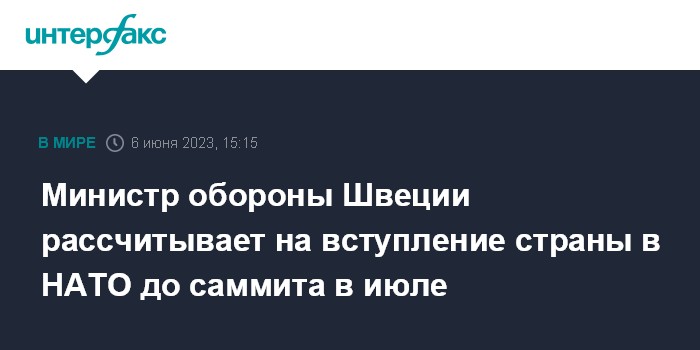 Москва. 6 июня. INTERFAX.RU - Швеция стремится завершить процесс присоединения к НАТО до июльского саммита альянса в Вильнюсе, заявил министр обороны страны Пол Юнсон. Об этом сообщает АР.