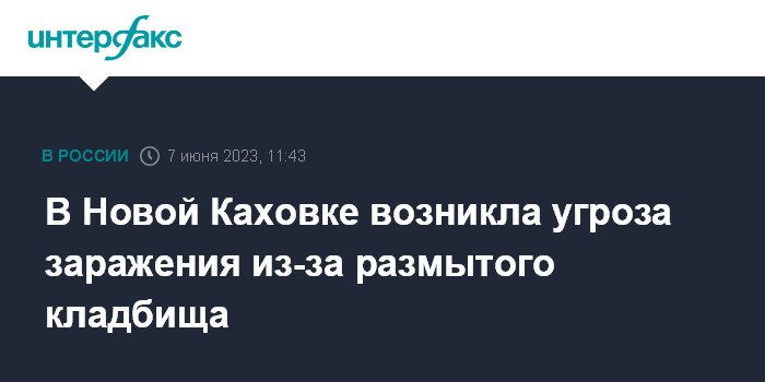 Москва. 7 июня. INTERFAX.RU - В Новой Каховке в районе Корсуньских дач около ста человек оказались заблокированы из-за наводнения после разрушения Каховской ГЭС, они ждут эвакуации, сообщил "Первому каналу" глава городского округа Владимир Леонтьев. Он также сообщил, что в городе размыло одно кладбище и возникла угроза заражения.