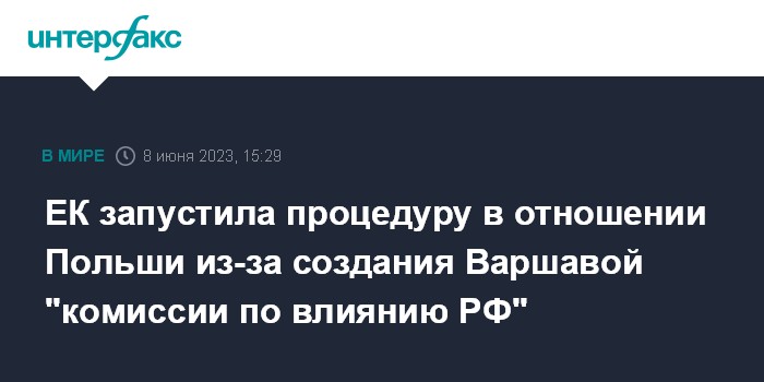"Это решение последовало за тщательной оценкой (Европейской) комиссией нового польского закона о государственной комиссии по изучению влияния России на внутреннюю безопасность Польши в период с 2007 по 2022 год, который действует с 31 мая 2023 года", - объясняется в коммюнике ЕК.