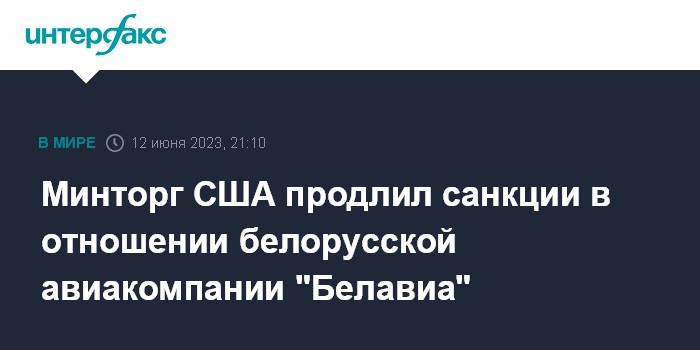 Москва. 12 июня. INTERFAX.RU - Бюро промышленности и безопасности (BIS) министерства торговли США продлевает на 180 дней санкции в отношении "Белавиа" за нарушения белорусской национальной авиакомпанией мер экспортного контроля.
