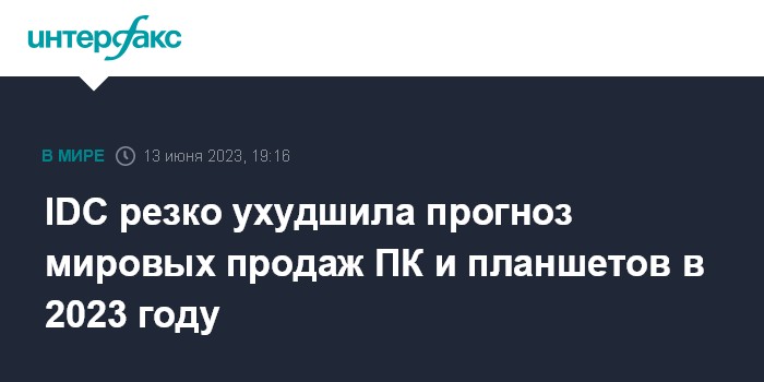 Москва. 13 июня. INTERFAX.RU - Мировые поставки персональных компьютеров (ПК) и планшетов в 2023 году сократятся на 15,2% и составят 384,8 млн штук, прогнозирует исследовательская компания International Data Corporation (IDC).
