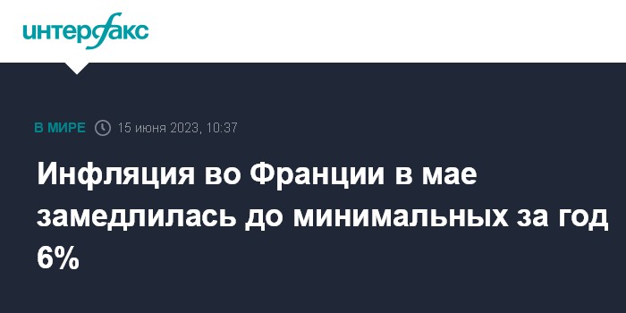 Москва. 15 июня. INTERFAX.RU - Потребительские цены во Франции, гармонизированные со стандартами Европейского союза, в мае увеличились на 6% в годовом выражении, минимальными темпами с мая прошлого года, говорится в окончательном отчете Национального статистического управления Insee.