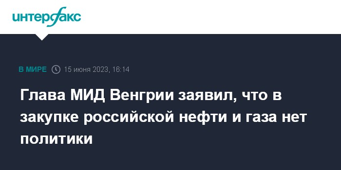 Глава МИД Венгрии заявил, что в закупке российской нефти и газа нет политики