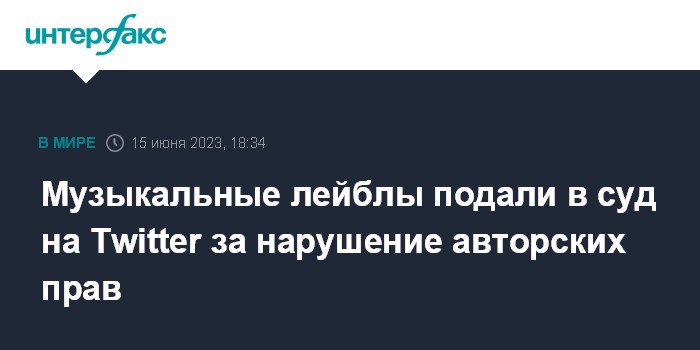 Москва. 15 июня. INTERFAX.RU - Участники Национальной ассоциации музыкальных издателей США (National Music Publishers' Association, NMPA), включая Sony Music Publishing и Universal Music, подали в федеральный суд Нэшвилла иск к Twitter, обвинив компанию за нарушение авторских прав. Об этом сообщает MarketWatch.