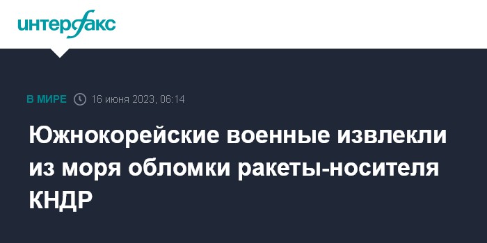 Москва. 16 июня. INTERFAX.RU - Южнокорейские военные извлекли из Желтого моря затонувшую часть запущенной КНДР 31 мая ракеты-носителя, сообщает агентство "Ренхап".