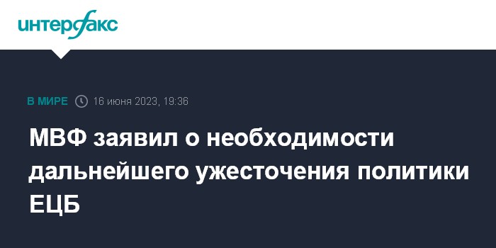 Москва. 16 июня. INTERFAX.RU - Европейскому центральному банку (ЕЦБ) необходимо продолжать ужесточение денежно-кредитной политики, чтобы добиться возврата инфляции к 2%-му целевому показателю, считают в Международном валютном фонде (МВФ).