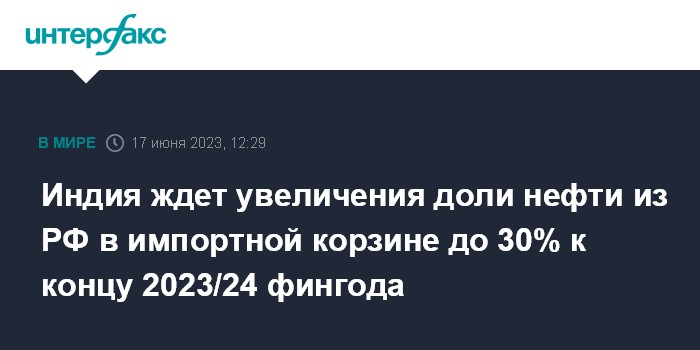 Москва. 17 июня. INTERFAX.RU - Доля российской нефти в общем объеме импорта Индии к концу 2023/2024 финансового года может достичь 30%, заявил глава индийской госкомпании Oil and Natural Gas Corp. (ONGC) Арун Кумар Сингх в ходе Энергетической панели ПМЭФ-2023.