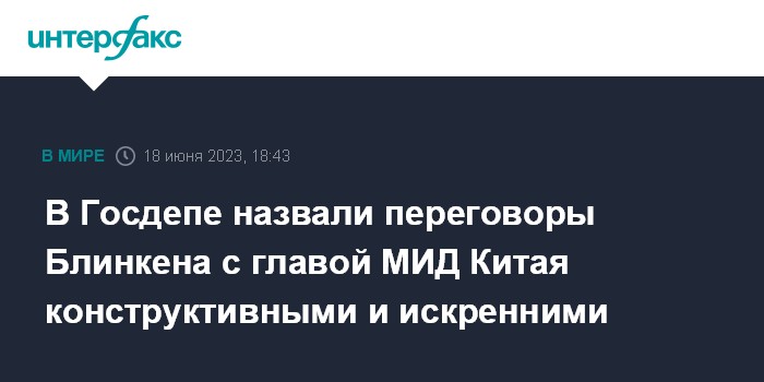 Москва. 18 июня. INTERFAX.RU - Переговоры госсекретаря США Энтони Блинкена и главы МИД Китая Цинь Гана прошли конструктивно, дипломаты обсудили двусторонние отношения, сообщили в Госдепе.