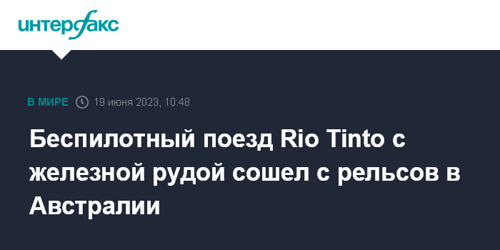 Москва. 19 июня. INTERFAX.RU - Беспилотный поезд примерно с 30 грузовыми вагонами сошел с рельсов в Австралии поздно вечером в субботу, сообщила Rio Tinto. Поезд перевозил железную руду с горнодобывающего предприятия в порт Дампьер на северо-западе штата Западная Австралия.