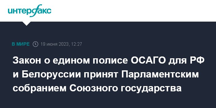 Москва. 19 июня. INTERFAX.RU - Парламентское собрание Союза России и Белоруссии на сессии в понедельник приняло модельный закон о распространении действия национального полиса автострахования (ОСАГО) на РФ и Белоруссию.