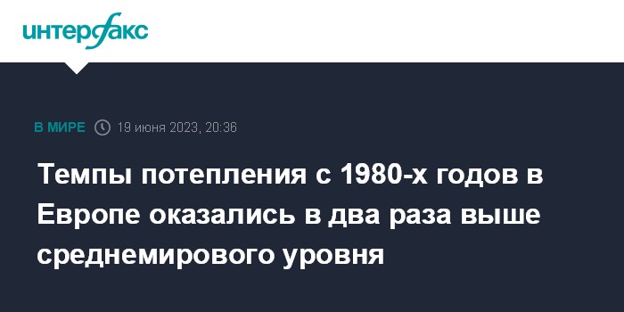 Москва. 19 июня. INTERFAX.RU - Скорость потепления климата в Европе с 1980-х годов превышает средний уровень потепления в мире, сообщила в понедельник Всемирная метеорологическая организация (ВМО, учреждение ООН).