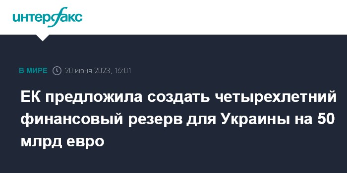 Москва. 20 июня. INTERFAX.RU - Глава Еврокомиссии (ЕК) Урсула фон дер Ляйен во вторник предложила утвердить финансовый резерв для Украины в размере 50 млрд евро на четырехлетний период.