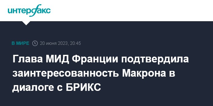 Москва. 20 июня. INTERFAX.RU - Глава МИД Франции Катрин Колонна в ходе визита в ЮАР заявила, что французский президент Эммануэль Макрон заинтересован в диалоге со странами БРИКС.