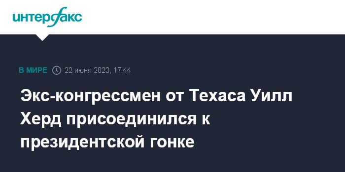 Москва. 22 июня. INTERFAX.RU - Бывший член Конгресса от штата Техас Уилл Херд в четверг объявил о решении присоединиться к борьбе за выдвижение кандидатом в президенты США от Республиканской партии, сообщает в четверг Associated Press.