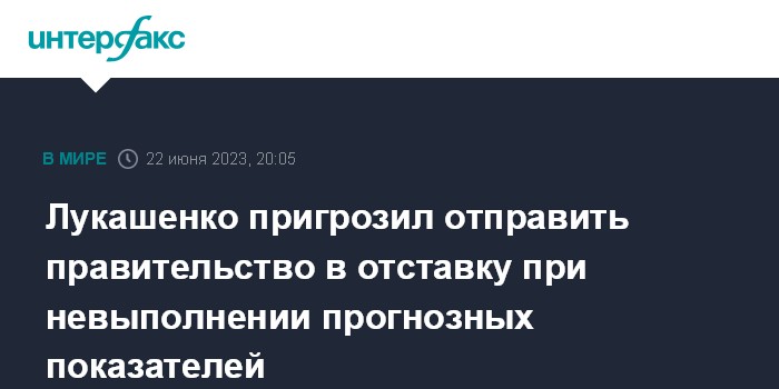 Москва. 22 июня. INTERFAX.RU - Президент Белоруссии Александр Лукашенко заявил, что правительство Белоруссии будет отправлено в отставку в случае невыполнения прогнозных экономических показателей на 2023 год.