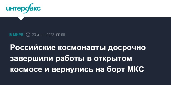 Москва. 22 июня. INTERFAX.RU - Российские космонавты Сергей Прокопьев и Дмитрий Петелин завершили работы в открытом космосе и вернулись на борт Международной космической станции (МКС) раньше запланированного, успешно выполнив все работы, сообщили в "Роскосмосе".