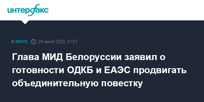 Москва. 24 июня. INTERFAX.RU - Министр иностранных дел Белоруссии Сергей Алейник заявил о готовности партнеров в ОДКБ и ЕАЭС продвигать объединительную повестку и развивать кооперацию.