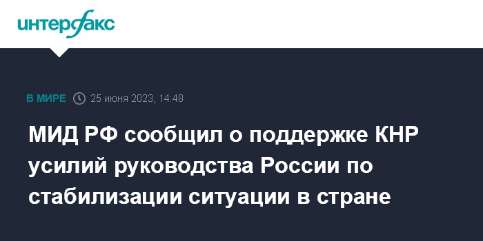 "Китайская сторона выразила поддержку усилиям руководства Российской Федерации по стабилизации ситуации в стране в связи с событиями 24 июня и подтвердила заинтересованность в укреплении сплоченности и дальнейшем процветании России", - говорится в сообщении российского МИД, размещенном на сайте ведомства.