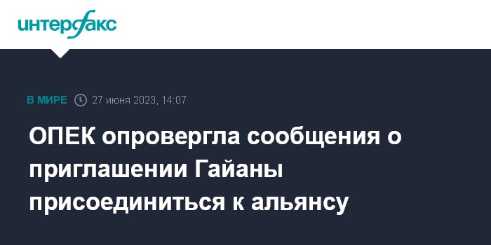 Москва. 27 июня. INTERFAX.RU - ОПЕК не предлагала Гайане стать членом альянса, при этом признает значительный потенциал страны на мировом нефтяном рынке, сообщается в пресс-релизе ОПЕК.