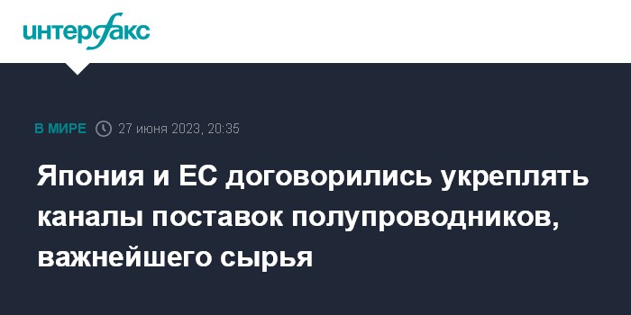 Москва. 27 июня. INTERFAX.RU - Представители Японии и ЕС во вторник достигли соглашения об усилении сотрудничества в сфере экономической безопасности за счет более стабильных поставок полупроводников и стратегических материалов, сообщает Kyodo.