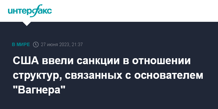 Москва. 27 июня. INTERFAX.RU - США во вторник внесли в санкционный список по России одно физическое и четыре юридических лица, которые имеют отношение к руководителю группы "Вагнер" Евгению Пригожину, сообщает американский Минфин.