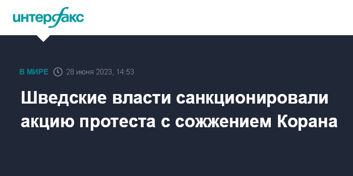 Москва. 28 июня. INTERFAX.RU - Полиция Швеции разрешила активистам провести в среду акцию протеста близ крупнейшей мечети Стокгольма, в ходе которой планируется сжечь Коран, сообщают европейские СМИ.