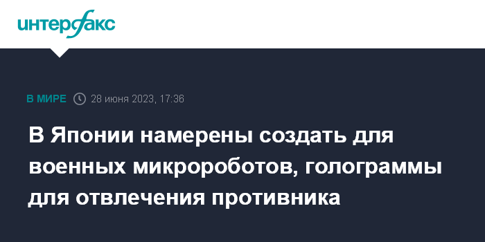 В частности, японские власти в течение следующего десятилетия хотят получить роботов размером с насекомое, самовосстанавливающиеся материалы, лазеры и сверхвысокочастотное оружие для уничтожения беспилотников, голограммы для отвлечения внимания противника.