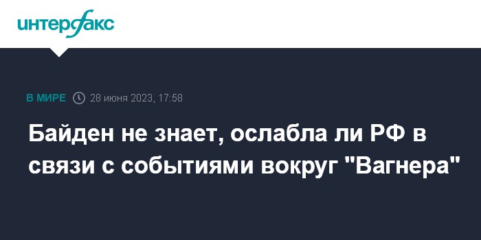 Москва. 28 июня. INTERFAX.RU - Президент США Джо Байден в среду заявил, что не может судить, ослабили ли власть в России недавние события, связанные с группой "Вагнер".