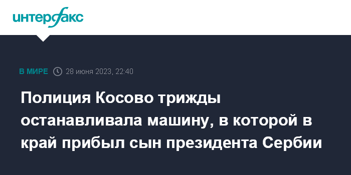 Москва. 28 июня. INTERFAX.RU - Косовская полиция три раза останавливала автомобиль, в котором находился сын президента Сербии Данило Вучич, который в среду приехал в Косово на мероприятия, приуроченные к Видовдану, когда сербы вспоминают битву на Косовом поле 1389 года.