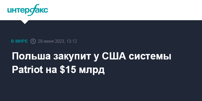 Москва. 29 июня. INTERFAX.RU - Польша приобретет у США системы зенитных ракетных комплексов Patriot на $15 млрд, сообщают в четверг западные СМИ со ссылкой на Пентагон.