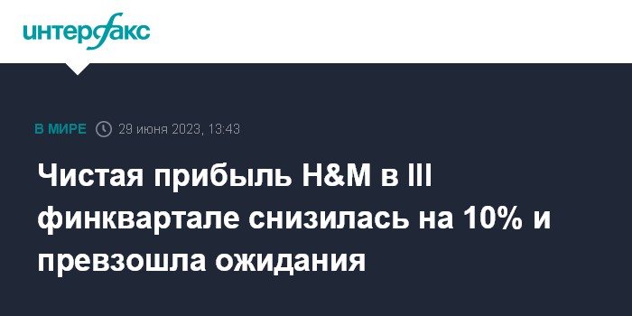 Москва. 29 июня. INTERFAX.RU - Hennes & Mauritz AB (H&M), владелец второй по величине в Европе сети магазинов одежды, в третьем квартале 2023 финансового года сократила чистую прибыль на 10%, однако результат оказался лучше прогноза аналитиков.