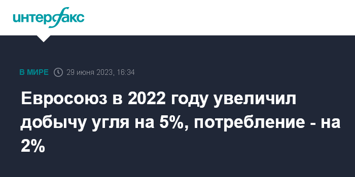Москва. 29 июня. INTERFAX.RU - Страны Европейского союза по итогам 2022 года увеличили добычу угля на 5% - до 349 млн тонн, следует из данных статистического управления ЕС.