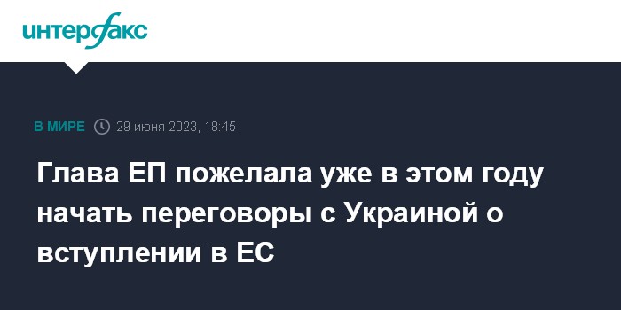 Москва. 29 июня. INTERFAX.RU - Председатель Европарламента (ЕП) Роберта Метсола заявила, что Украина продолжит оставаться ключевым вопросом внешней политики ЕС и высказалась за начало переговоров о вступлении страны в Евросоюз еще в нынешнем году.