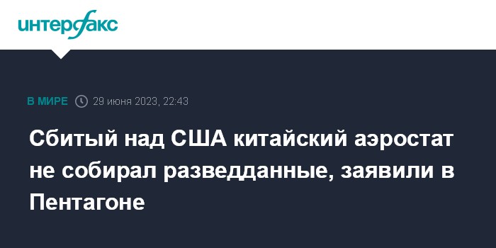 Москва. 29 июня. INTERFAX.RU - Сбитый в феврале военными США китайский аэростат не вел сбор разведанных во время полета над американской территорией, заявил в четверг представитель Пентагона Пэт Райдер.