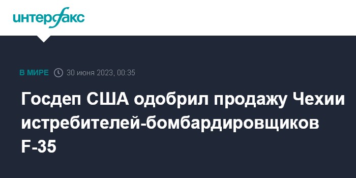 Москва. 30 июня. INTERFAX.RU - Агентство по оборонному сотрудничеству США сообщило об одобрении возможной сделки по продаже Чехии истребителей-бомбардировщиков F-35 на сумму до $5,62 млрд.