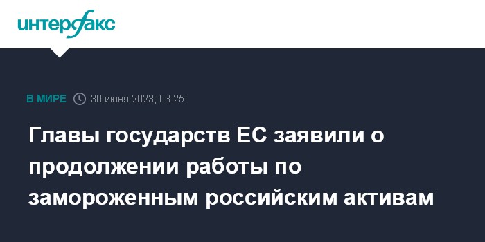 Москва. 30 июня. INTERFAX.RU -Лидеры стран Евросоюза (ЕС) заявили, что займутся вместе с Еврокомиссией и главой европейской дипломатии Жозепом Боррелем координацией с партнерами позиции по поводу того, как можно было бы использовать замороженные российские активы для помощи Украине.