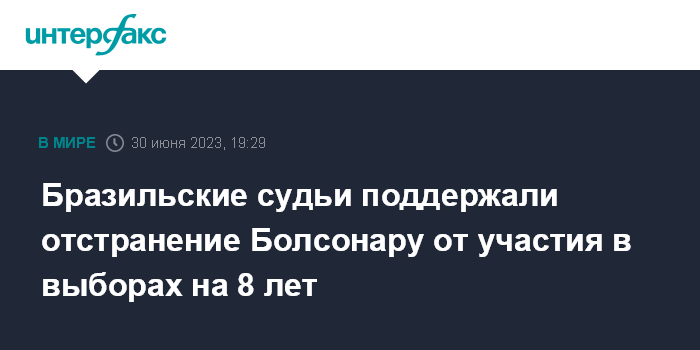 Москва. 30 июня. INTERFAX.RU - Большинство судей Верховного избирательного суда Бразилии на голосовании в среду поддержали запрет на участие экс-президента страны Жаира Болсонару в каких-либо выборах в течение восьми лет, информирует бразильский медиахолдинг "Глобу".