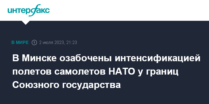 Москва. 2 июля. INTERFAX.RU - В белорусском Минобороны отметили увеличение количества полетов авиации НАТО, в том числе разведывательной, вблизи границ Белоруссии и Союзного государства.