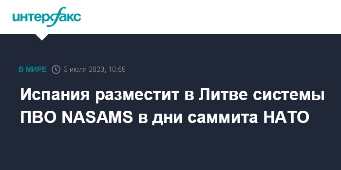 "Можем подтвердить, что Испания вносит свой вклад в обеспечение безопасности саммита НАТО в Вильнюсе с помощью пусковых комплексов ПВО NASAMS", - говорится в ответе дипмиссии журналистам.