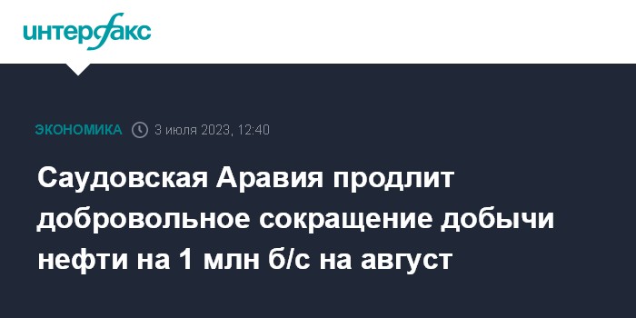 Москва. 3 июля. INTERFAX.RU - Саудовская Аравия продлит добровольное сокращение добычи нефти, принятое на июль в объеме 1 млн баррелей в сутки, еще и на август, сообщило государственное агентство королевства со ссылкой на официальный источник в Министерстве энергетики.
