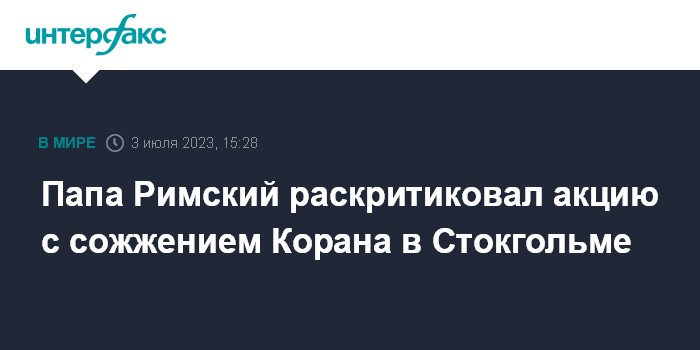 Москва. 3 июля. INTERFAX.RU - Папа Римский Франциск в понедельник осудил акцию сожжения Корана в Швеции, заявив, что такие действия нельзя оправдывать свободой слова, сообщают западные СМИ.