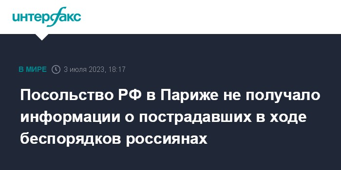 "В связи с происходящими во Франции массовыми беспорядками сообщаем, что расположенные на территории страны росзагранучреждения затронуты не были. Информации об инцидентах с участием российских граждан, а также о пострадавших среди них не поступало", - говорится в сообщении в телеграм-канале дипмиссии.