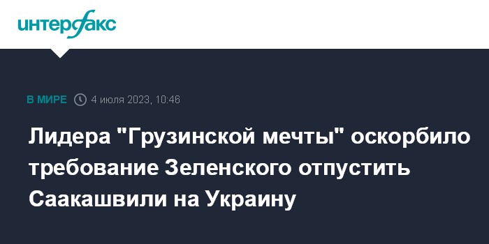 Москва. 4 июля. INTERFAX.RU - Председатель правящей партии "Грузинская мечта" Ираклий Кобахидзе отверг требование президента Украины Владимира Зеленского направить бывшего президента Грузии Михаила Саакашвили на лечение в Киев.