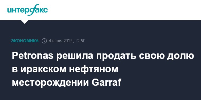 Москва. 4 июля. INTERFAX.RU - Малайзийская Petronas уведомила иракскую сторону, что хочет продать свою долю оператора в нефтяном месторождении Garraf (Гарраф) производительностью 155 тысяч баррелей в сутки, пишет Iraq Oil Report и называет это признаком недовольства инвестиционным климатом Ирака.