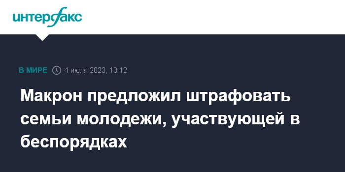 Москва. 4 июля. INTERFAX.RU - Президент Франции Эммануэль Макрон намерен применять финансовые наказания к семьям молодых людей, принимающих участие в нарушениях общественного порядка, сообщает France24.