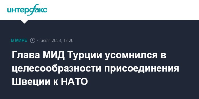 Москва. 4 июля. INTERFAX.RU - Министр иностранных дел Турции Хакан Фидан усомнился в целесообразности принятия Швеции в НАТО с точки зрения стратегической безопасности, сообщает во вторник газета Daily Sabah.