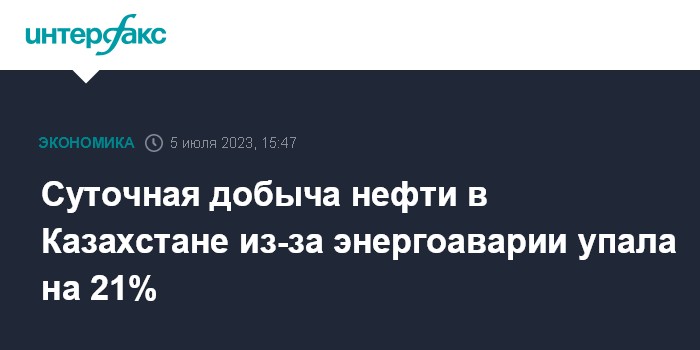 Москва. 5 июля. INTERFAX.RU - Суточная добыча нефти в Казахстане снизилась на 21% из-за сбоев в энергоснабжении на западе страны, где сосредоточены основные месторождения, свидетельствуют данные информационно-аналитического центра нефти и газа Минэнерго.