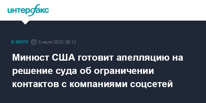 Москва. 6 июля. INTERFAX.RU - Министерство юстиции США намерено обжаловать решение окружного суда штата Луизиана, которое ограничивает общение чиновников администрации президента Байдена с компаниями социальных сетей, и готовится подать апелляцию в апелляционный суд 5-го округа в Новом Орлеане, сообщила The Hill.