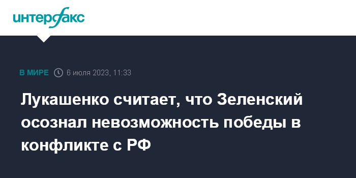 Москва. 6 июля. INTERFAX.RU - Президент Украины Владимир Зеленский был окрылен обещаниями Запада, но сейчас понял, что не победит в противостоянии с Россией, заявил президент Белоруссии Александр Лукашенко.