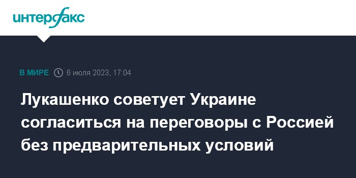 Москва. 6 июля. INTERFAX.RU - Президент Белоруссии Александр Лукашенко считает, что руководство России готово к мирным переговорам по Украине, призывает Киев воспользоваться моментом и начать переговоры без предварительных условий.